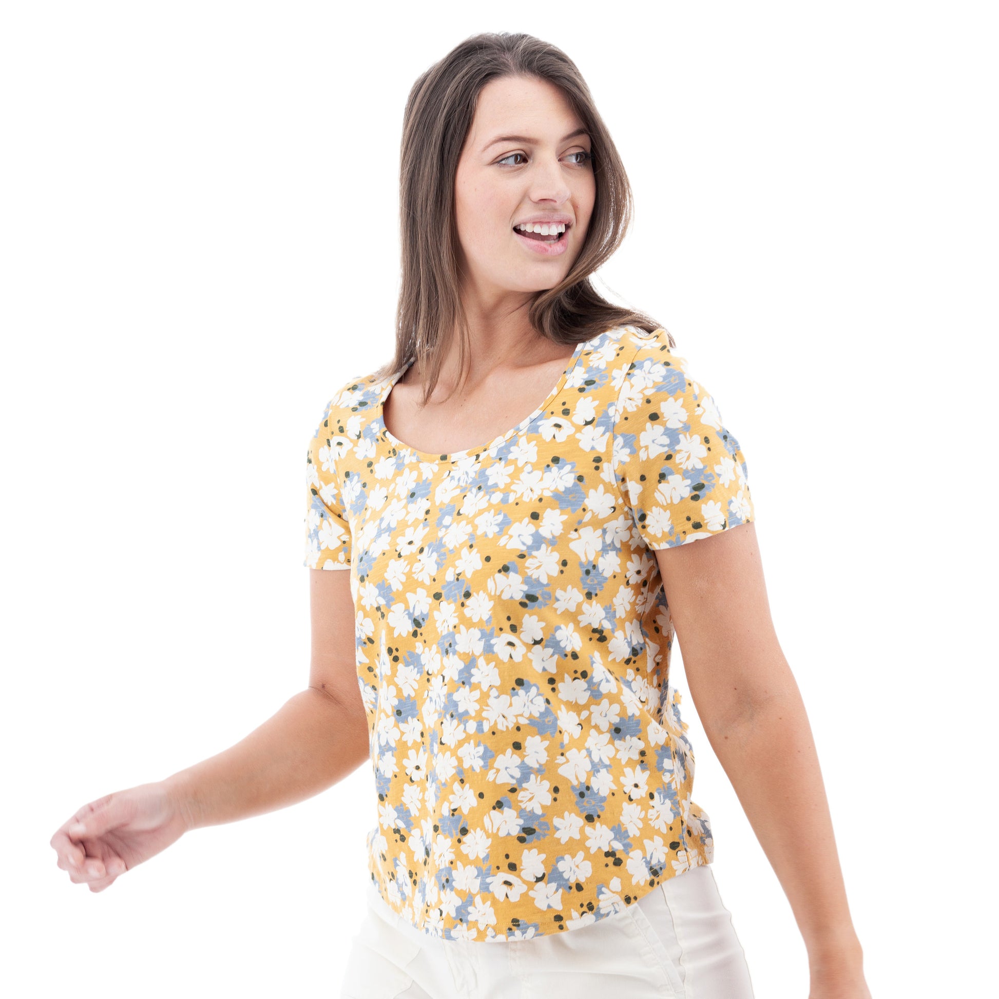 The Kenley Scoop Neck Print Tee's sunny floral print is the dose of happiness we can bring to your summer days...especially when paired with thoughtful design and luxurious fabric. The design includes an elegant and flattering wide scoop neck and shirttail hem, which helps direct the drape and movement of the top. We chose to organic cotton to craft this top's slub jersey fabric because it is sustainable, gentle on the skin, and easy to care for. The slub jersey further transforms the soft fabric into something that feels natural and as soft as your favorite vintage tee. We hope this top makes you feel simply beautiful!
