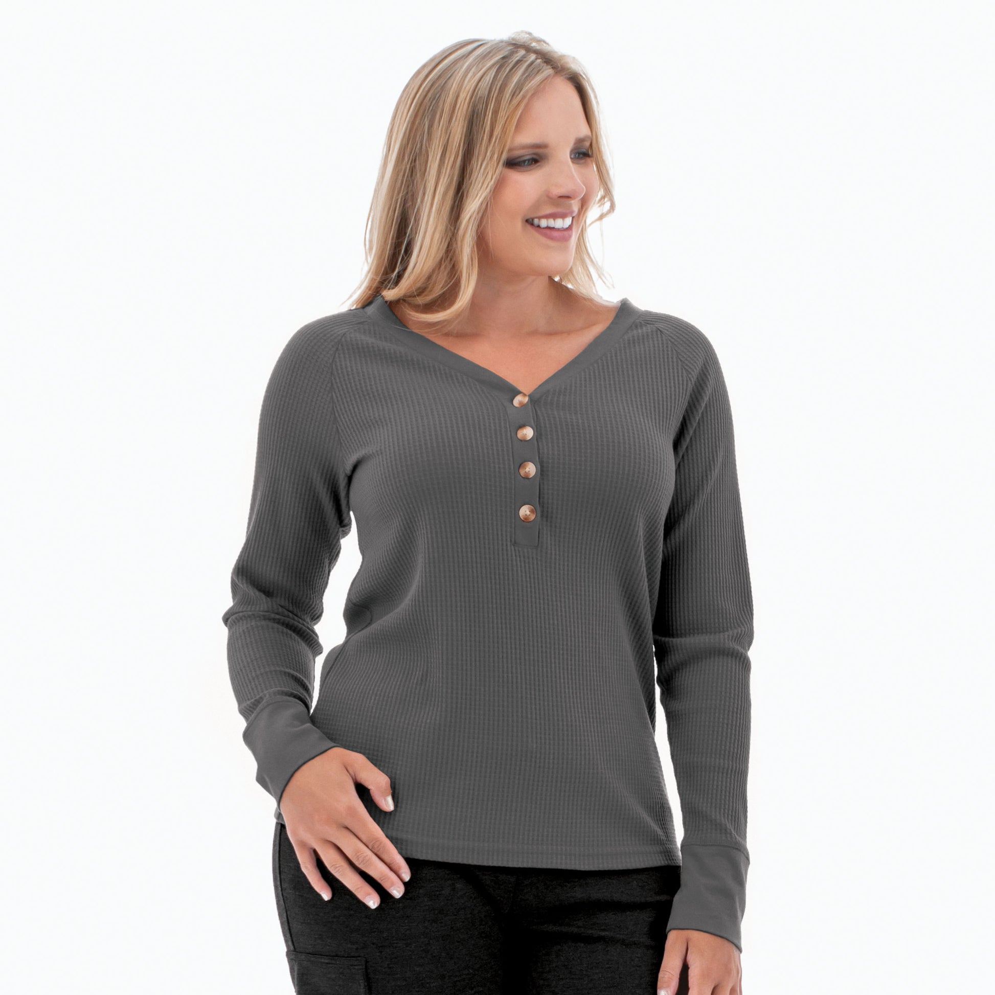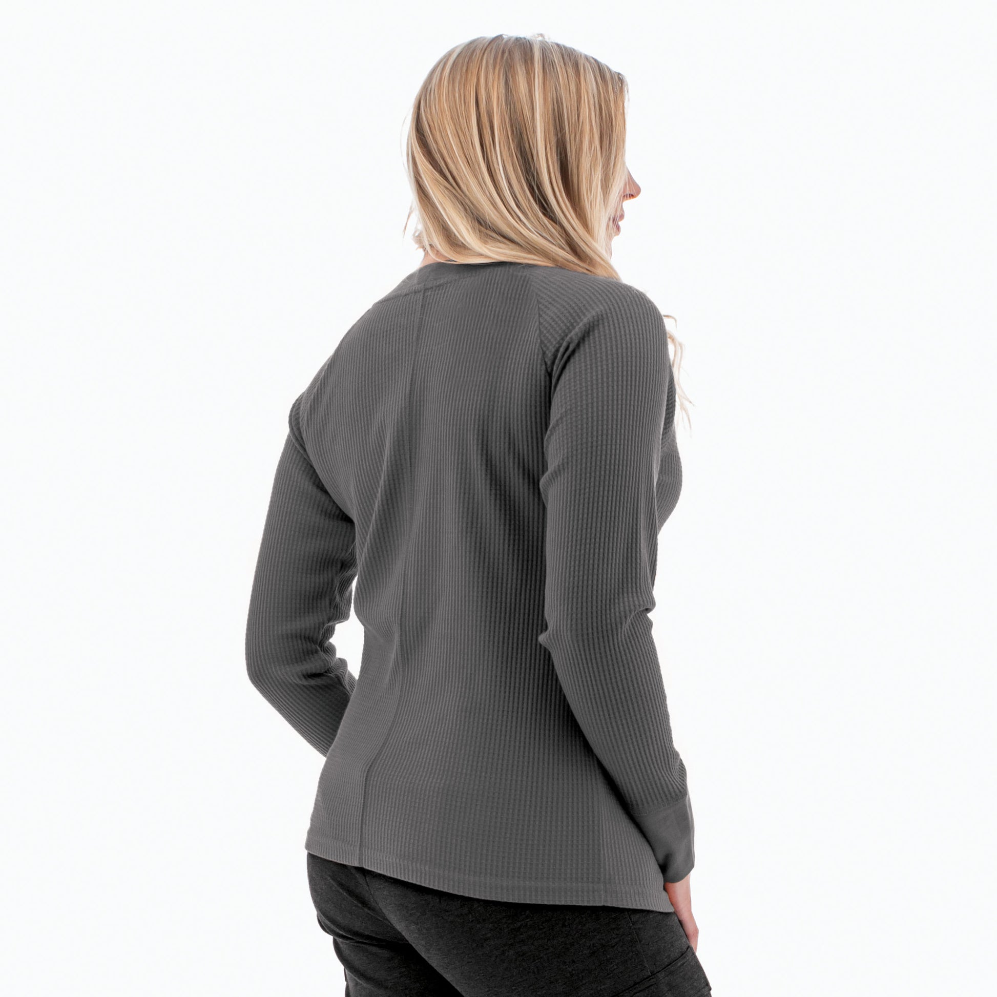 100% sustainable and 100% loveable, the Remy Henley is a key piece for any wardrobe. Eco-conscious cotton from Better Cotton Initiative (BCI™) and recycled polyester come together to create a waffleknit with excellent handfeel. Textured, soft, and with a forgiving stretch, this fabric will have you craving cold weather. We love how breathable this top is, perfect to wear under heavy layers. Even more than that, we love how roomy and comfortable our arms are because of the raglan sleeves. A feminine V-neck accentuates the front, coming to a point at a placket with functional buttons.